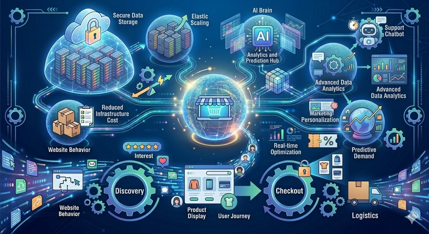 Cloud computing giúp nền tảng thương mại điện tử hoạt động linh hoạt và dễ dàng mở rộng.