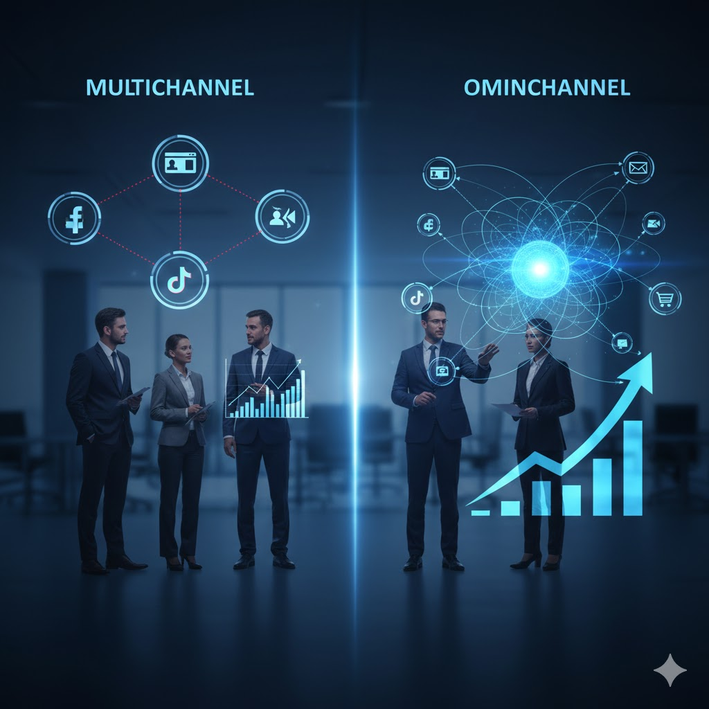 Không giống như mô hình đa kênh (multichannel) – nơi mỗi kênh hoạt động độc lập – omnichannel kết nối tất cả các kênh trong một hệ thống dữ liệu chung.